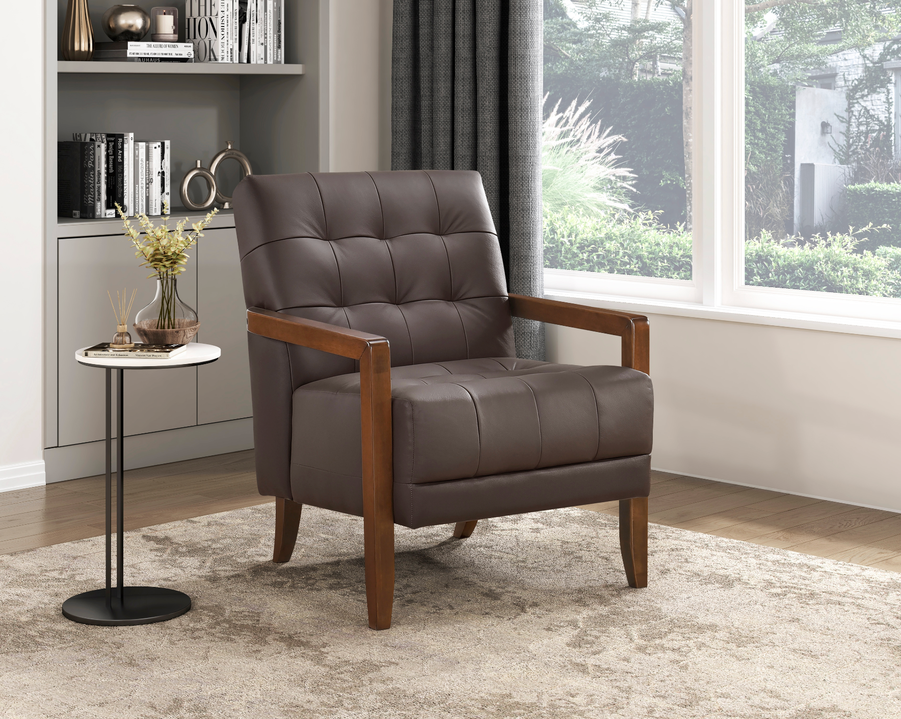 This elegant dark brown leather accent chair exudes sophistication and timeless charm. Upholstered in rich, supple leather, its deep, warm hue adds a sense of luxury to any room, while the smooth texture ensures both comfort and durability. The chair features a solid wood frame in a rich walnut finish, adding a touch of classic craftsmanship that complements the leather beautifully. The refined, clean lines of the design make it a versatile piece that seamlessly integrates into a variety of interior styles, from traditional to modern. Perfect for adding a statement of style and comfort to living rooms, reading nooks, or home offices, this accent chair is as inviting as it is visually striking.