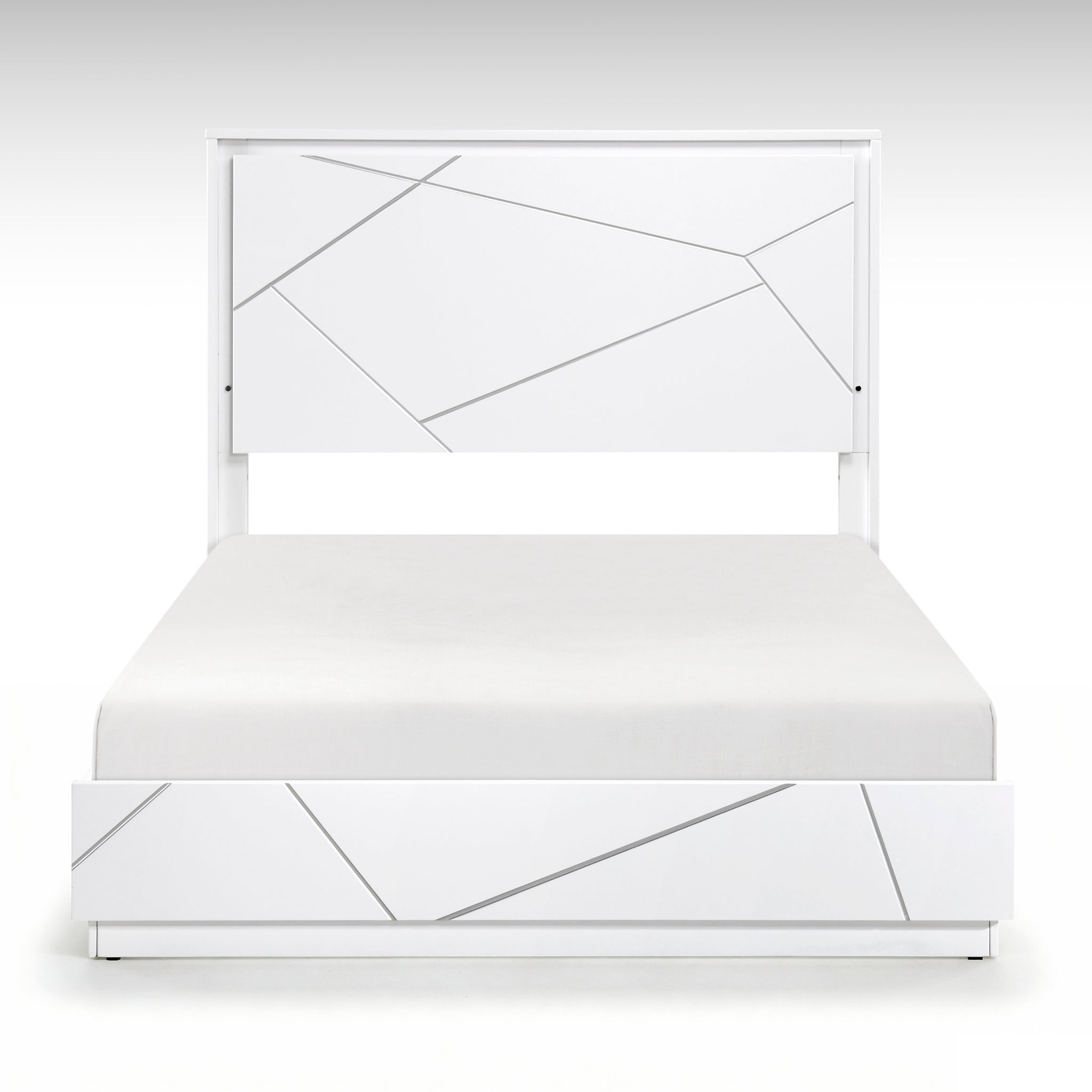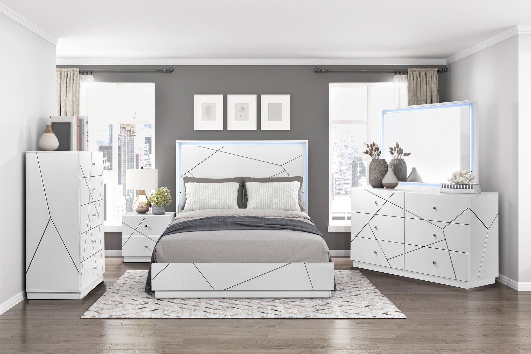 Elevate your bedroom's aesthetic with this stunning, modern white collection, blending high-style design with contemporary functionality. The centerpiece is a sleek panel bed (available in queen, king, or California king), featuring distinctive etched geometric line accents and integrated LED lighting in the headboard for ambient illumination. Complementing the bed are matching case goods—including the nightstand, 6-drawer dresser, 5-drawer chest, and illuminated mirror—all crafted from durable wood and engineered wood in a crisp white finish. Storage is maximized through spacious drawers that operate smoothly on ball-bearing glides and are accented with sleek chrome-tone knobs, ensuring this collection provides a luxurious, organized, and high-tech modern retreat.
