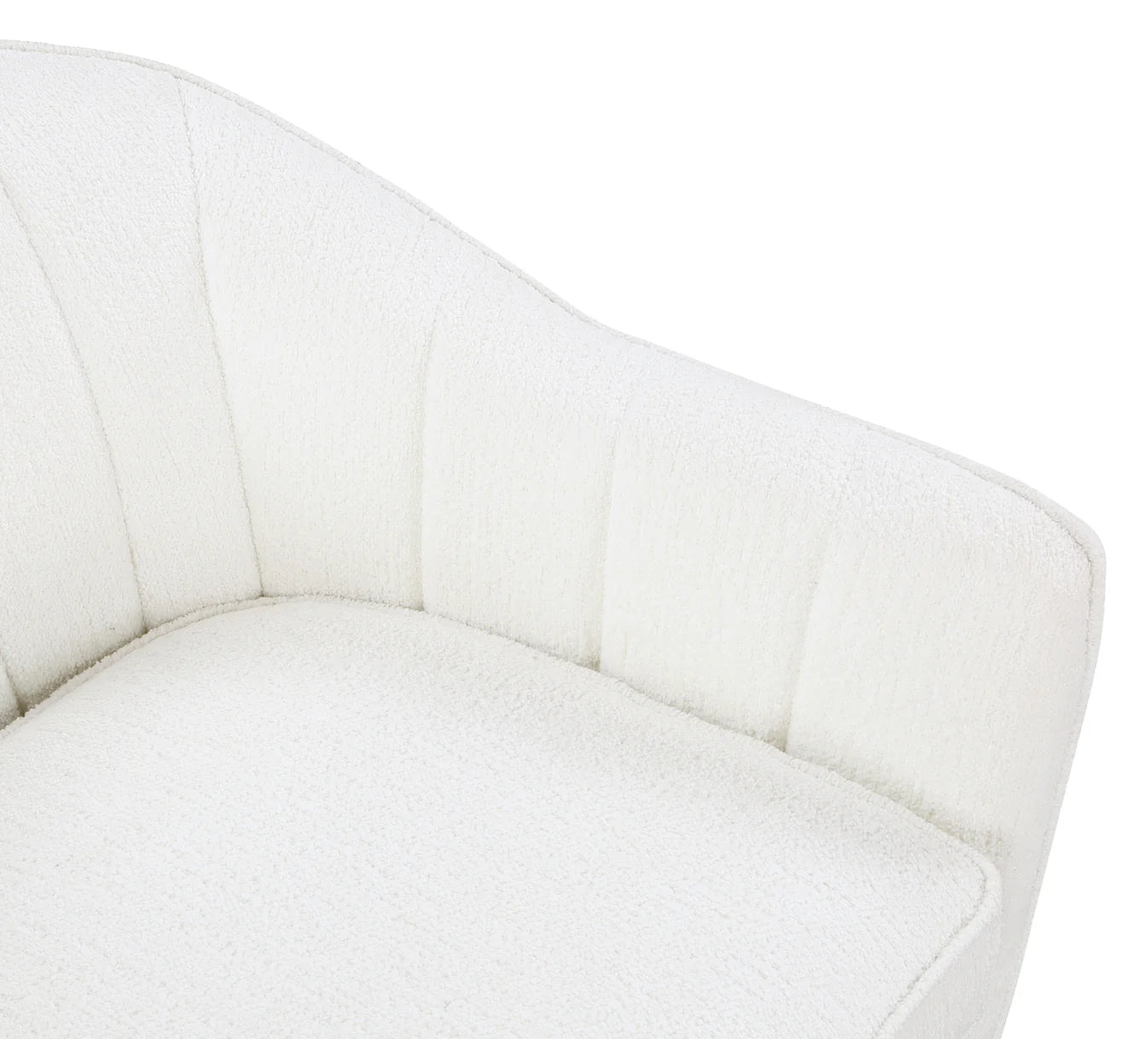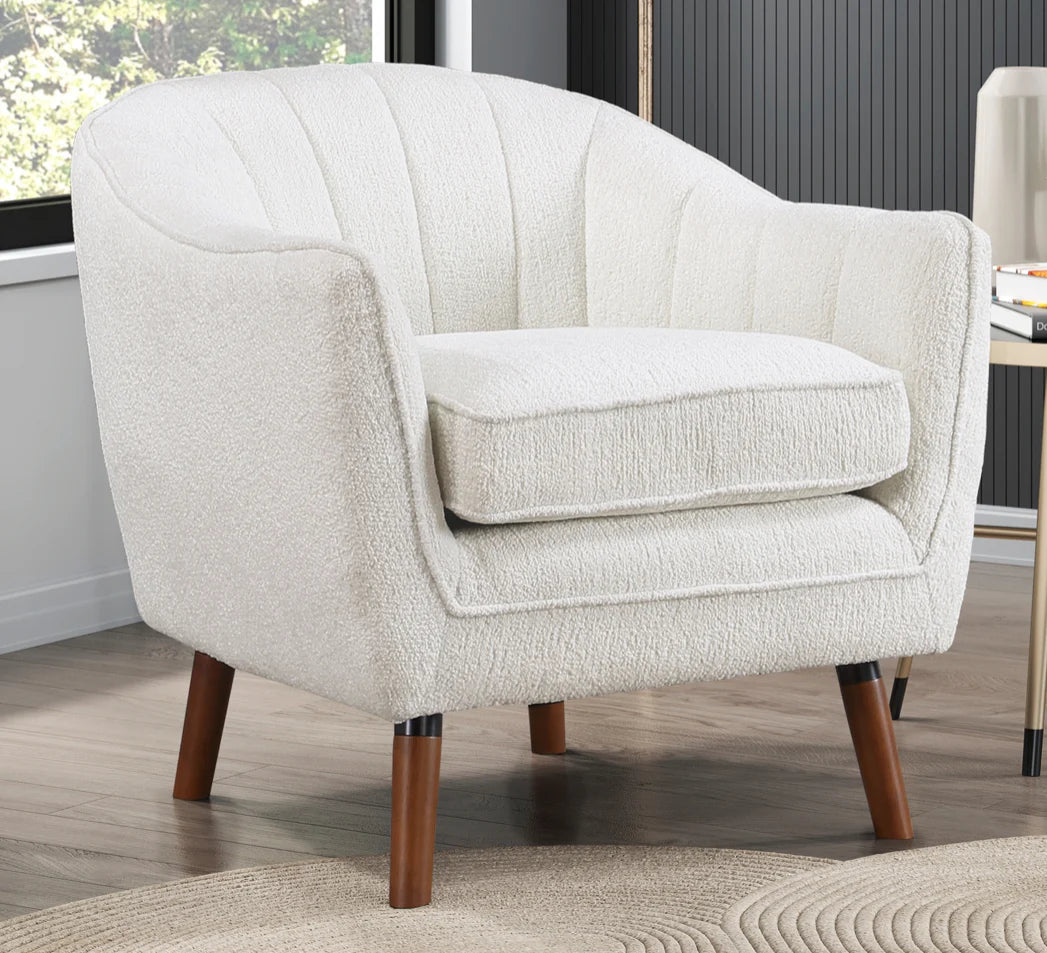 Inspired by the refined styling of the Mid-Century Modern movement, the Cutler Collection presents a tailored profile to pair with your home’s décor. The curved channel-tufted frame envelopes your seated experience while the white textured fabric upholstery is complemented by the brown-finished wood legs.