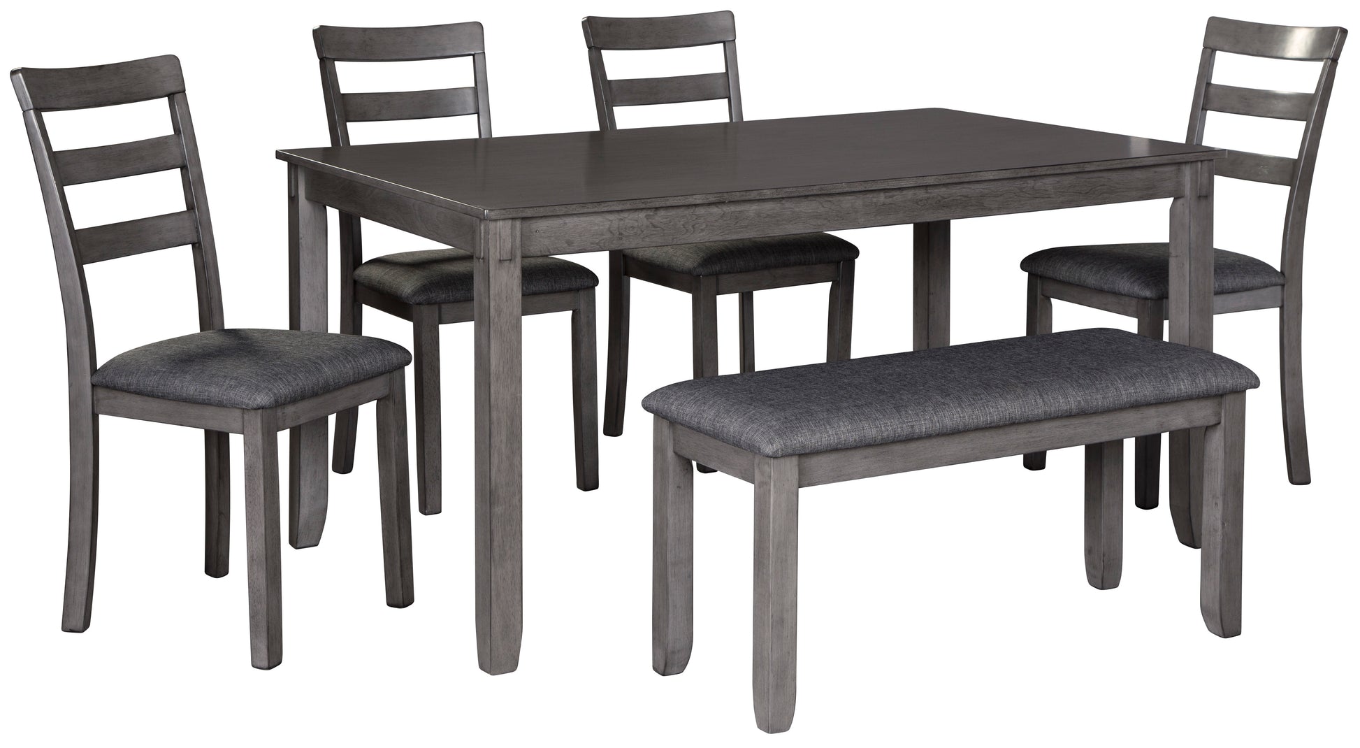 It’s so easy being gray—at least this 6-piece dining set makes it seem that way. This transitional dining table set sports a charcoal gray finish with textured gray upholstery for an on-trend and relevant appeal. Plushly upholstered seat cushions in a practical polyfiber make it a pleasure to linger at the table. Brilliantly styled seating choices add interest and versatility at mealtime.