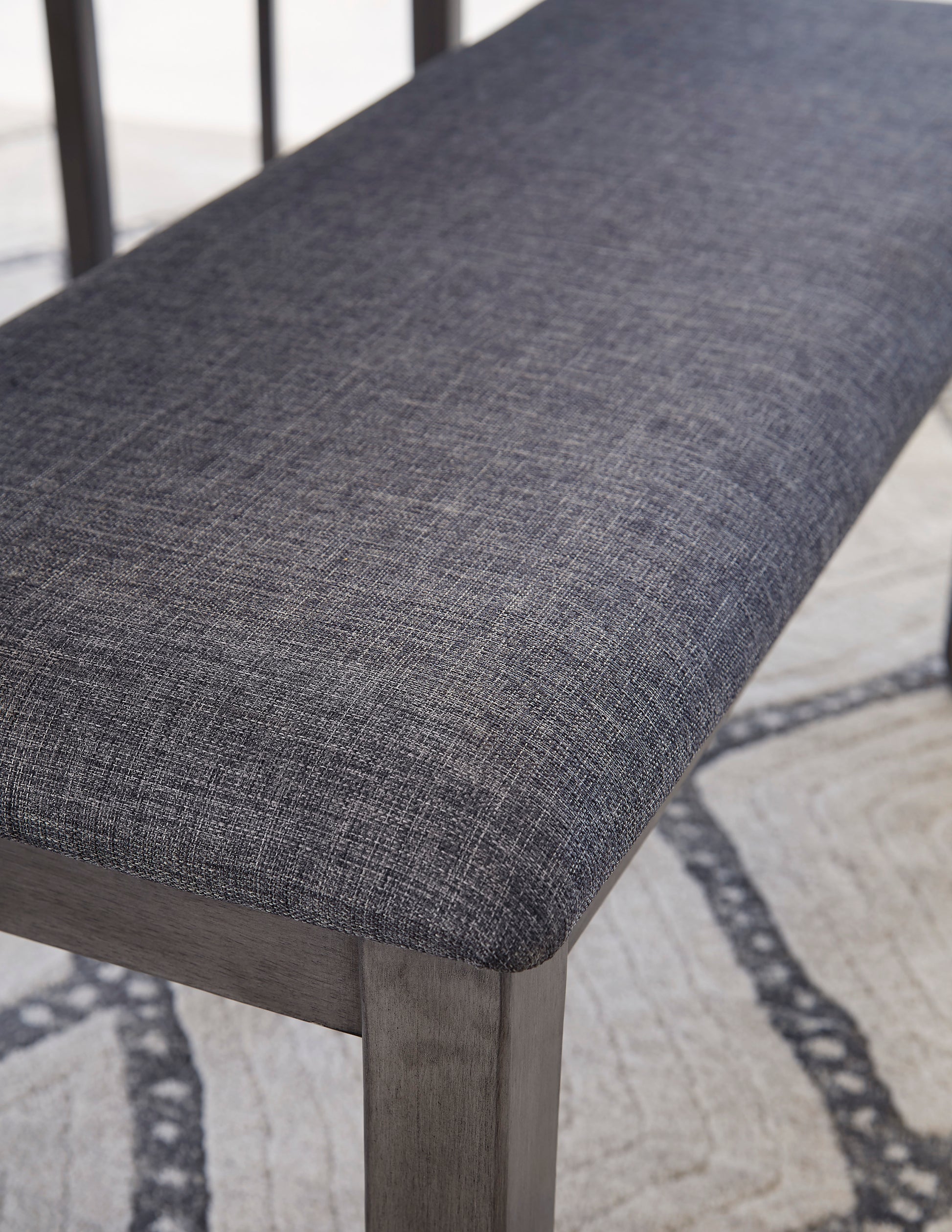 - Cushioned seats covered in textured gray polyester upholstery