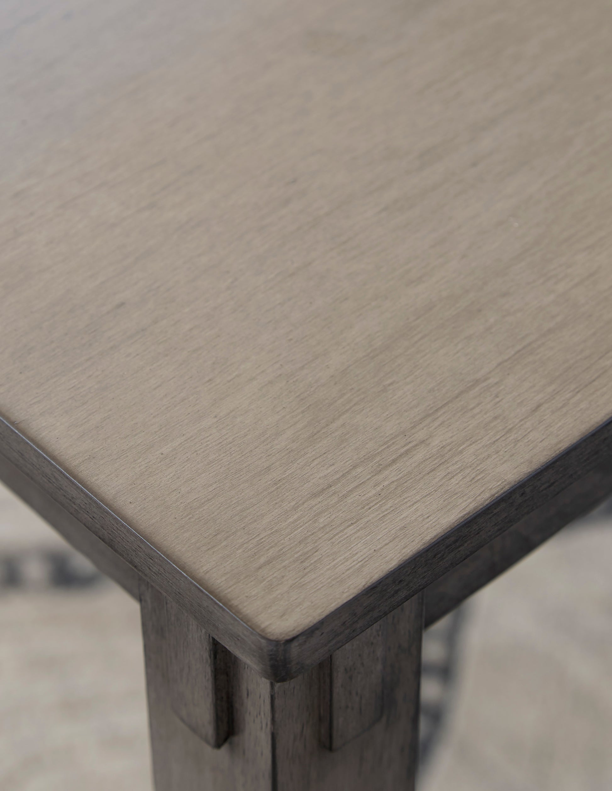 Casual dining and counter height set with a timeless transitional design. Made with select solid wood, Birch veneer and engineered wood substrate. Medium charcoal gray wood finish. Simple ladderback chairs and stools. Soft cushioned seats with a textured gray polyester fabric. Tables feature tapered leg design with a through tennon look.