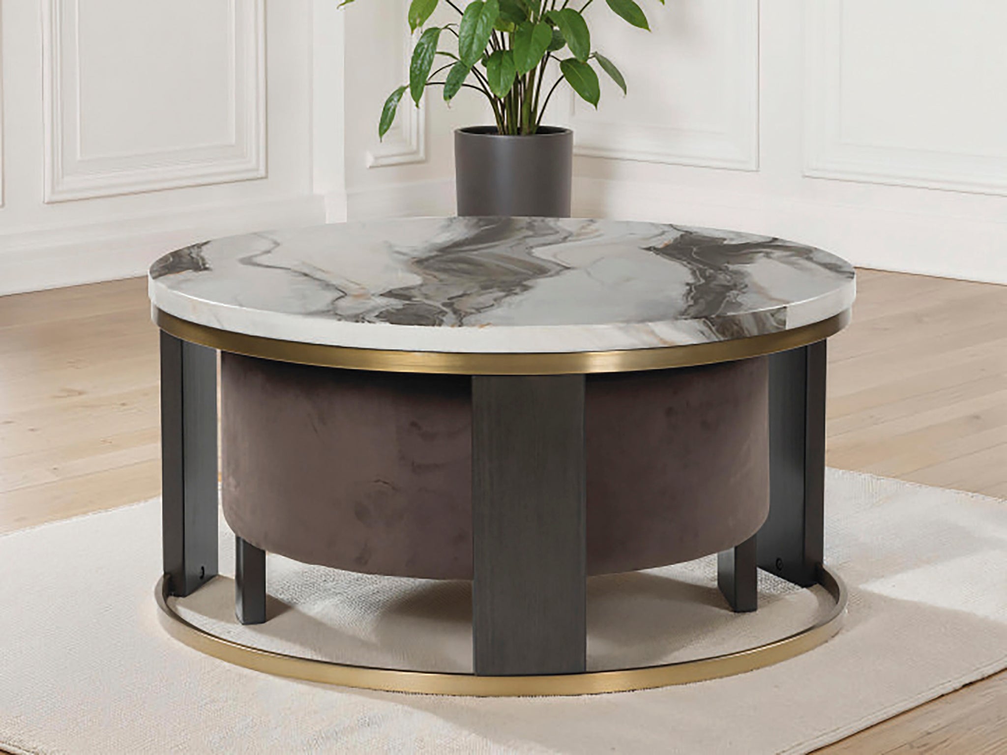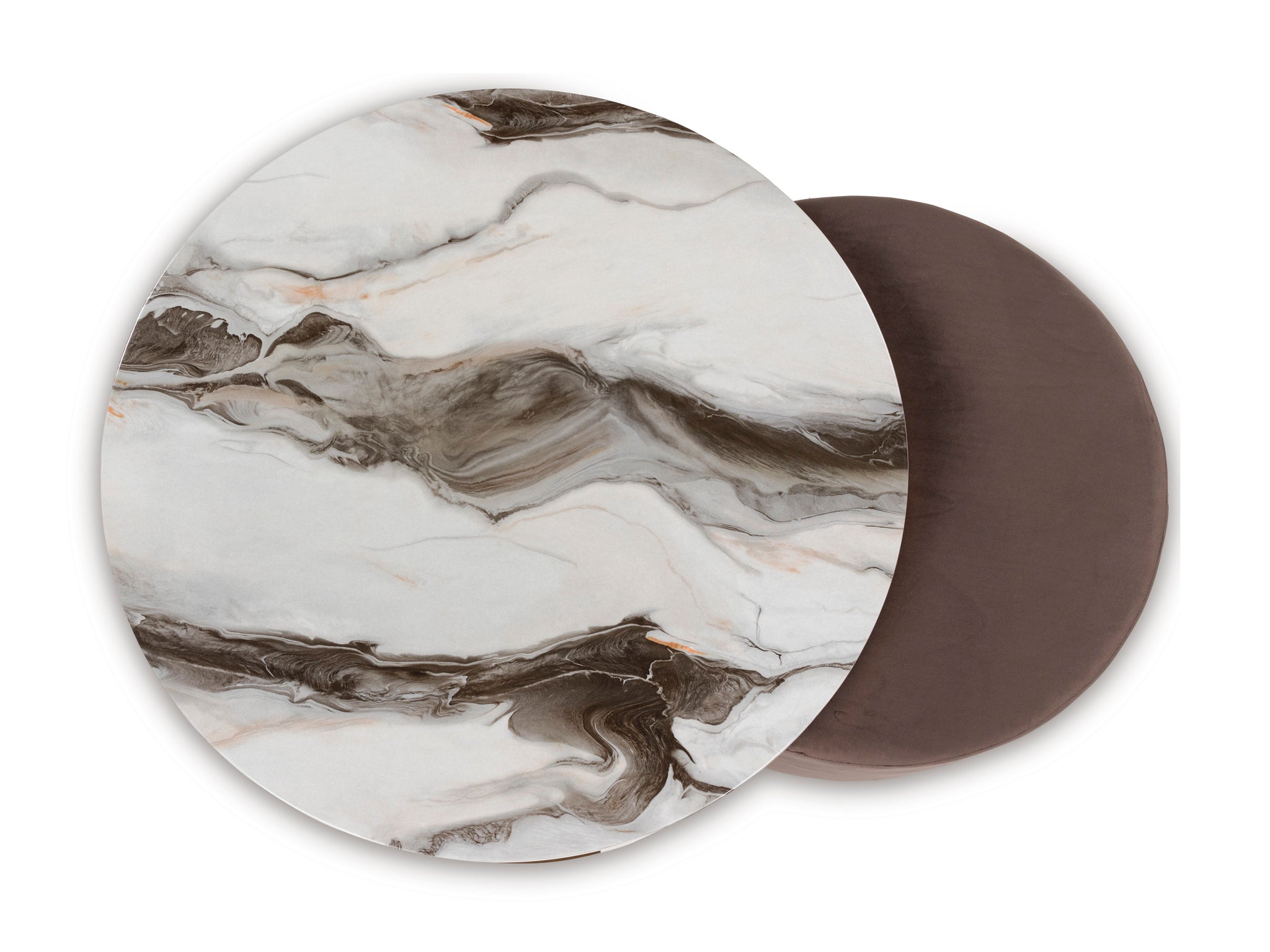 Ultra-contemporary design, everyday convenience. This trend-forward nesting coffee table completes your confidently curated living room with its marble-patterned top and eye-catching brass-tone frame. Dark wood grain on the legs provides a beautiful contrast. Paired with a nesting ottoman in chocolate brown velvet upholstery, this piece serves up must-have function in sophisticated style.