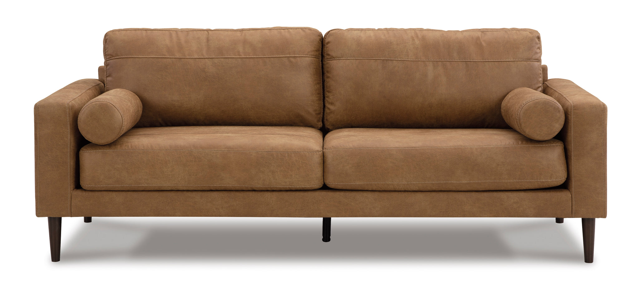 Small-scale style, tailored to perfection. This sofa echoes retro aesthetics with warm caramel faux leather, while its ultra-linear silhouette incorporates a contemporary edge. Versatile in form and function, the seat suits styles from modern boho to transitional. And its size helps you to confidently curate your compact space without sacrificing comfort (or your budget).