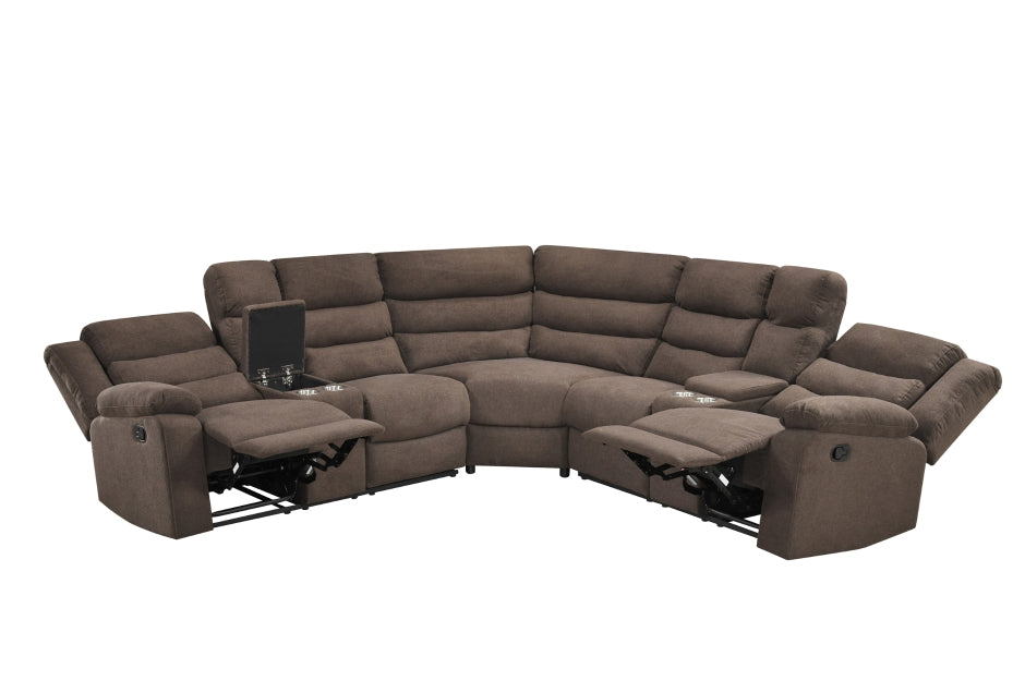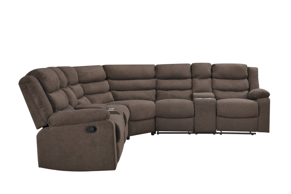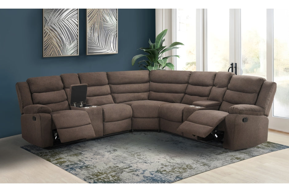 Big on convenience with support you can count on, this Brown Storage Recliner Sectional Collection is made to make an impression. This 3-piece sectional has a symmetrical corner design with reclining console loveseats on either end and a spacious configuration that invites conversation, connection, and comfort. Perfect for entertaining, stretching out for a movie night, or gathering friends and family, there’s room for everyone! Wrapped in plush textured grey fabric, the upholstery’s neutral tone and soft texture feels as good as it looks. Created with plump overstuffed backs, pillowy arms, and padded seats, it delivers full body support with a lounge-worthy feel. Recline with ease at either end by pulling the tab-latch mechanism and keep your devices and beverages handy with the dual storage consoles and integrated cupholders. Sturdily constructed with lasting support, the Rashid anchors your living room while providing functionality and everyday ease.