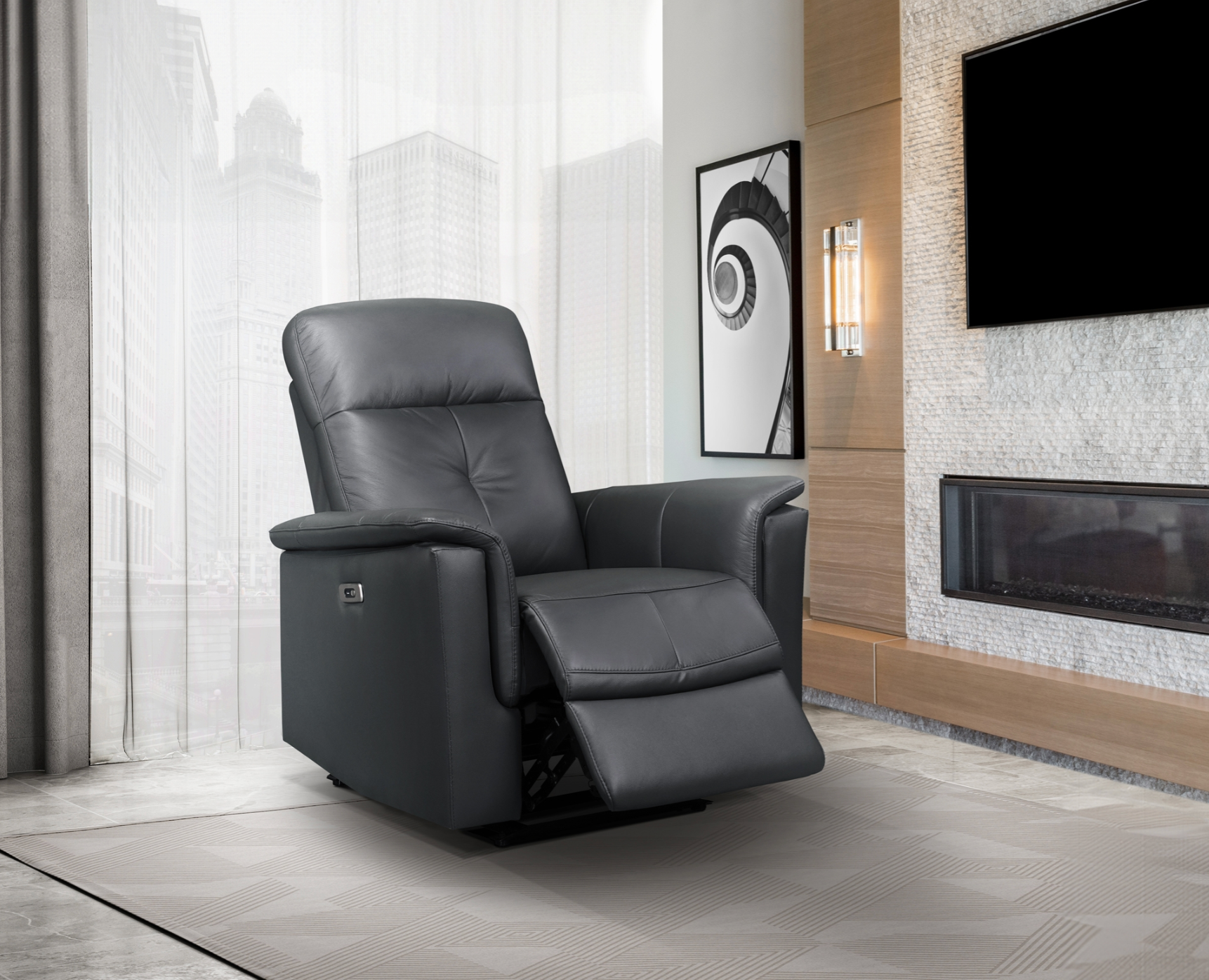 Sit back, put your feet up, and relax with the Bristow Collection. This power glider recliner allows you to fully engage with your surroundings with unparalleled comfort and supportive seat construction. Customizable reclining positions are at your fingertips with one touch of the side-mounted power control, and the glider function's gentle motion is as serenely smooth as can be. Tasteful dark grey top grain leather upholstery with faux leather-match covers the chair, providing a debonair compromise that looks and feels elegant precisely where it counts the most, all while perfectly complementing your home’s décor with its tailored touches.