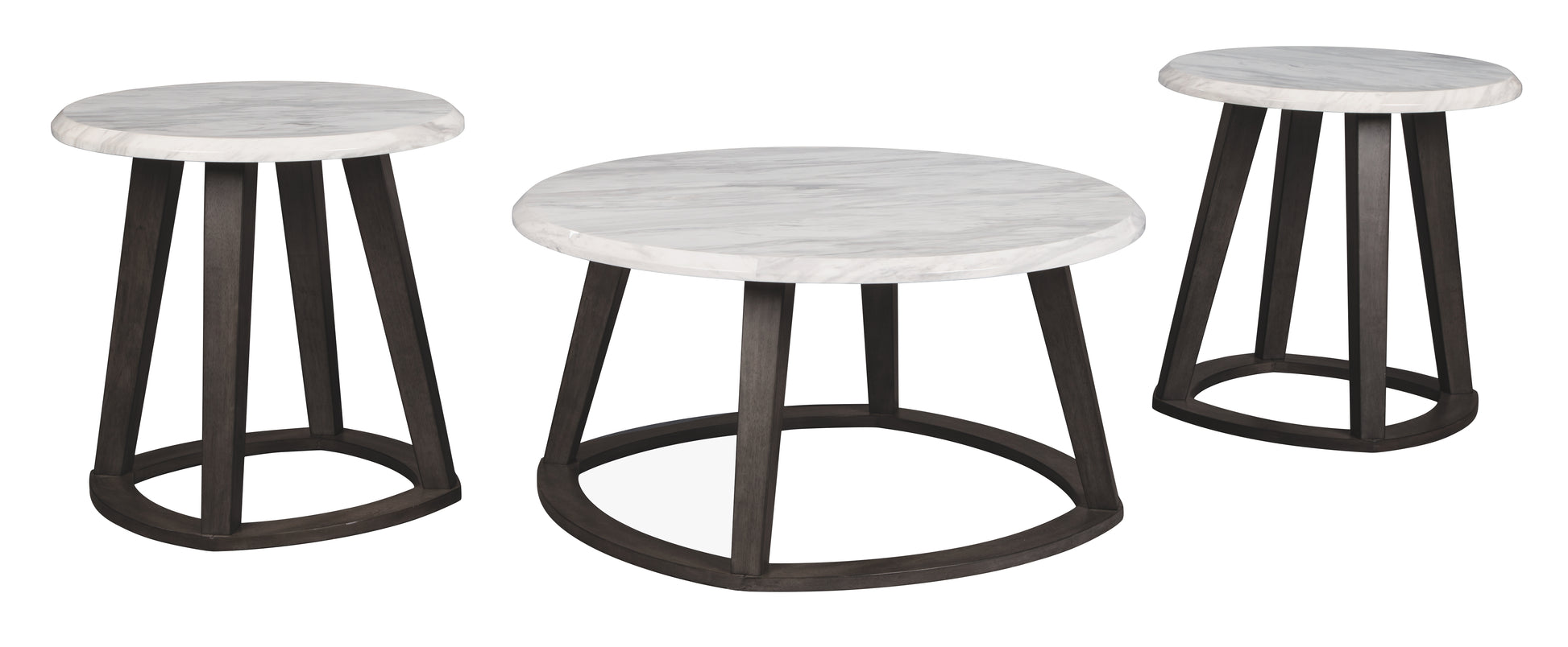 This round coffee table set makes upping your style as easy as 1-2-3. Faux Carrara marble tabletops bring an upscale look to the scene. Finished in a sleek matte black, the sculptural bases with canted legs are cool from every angle.