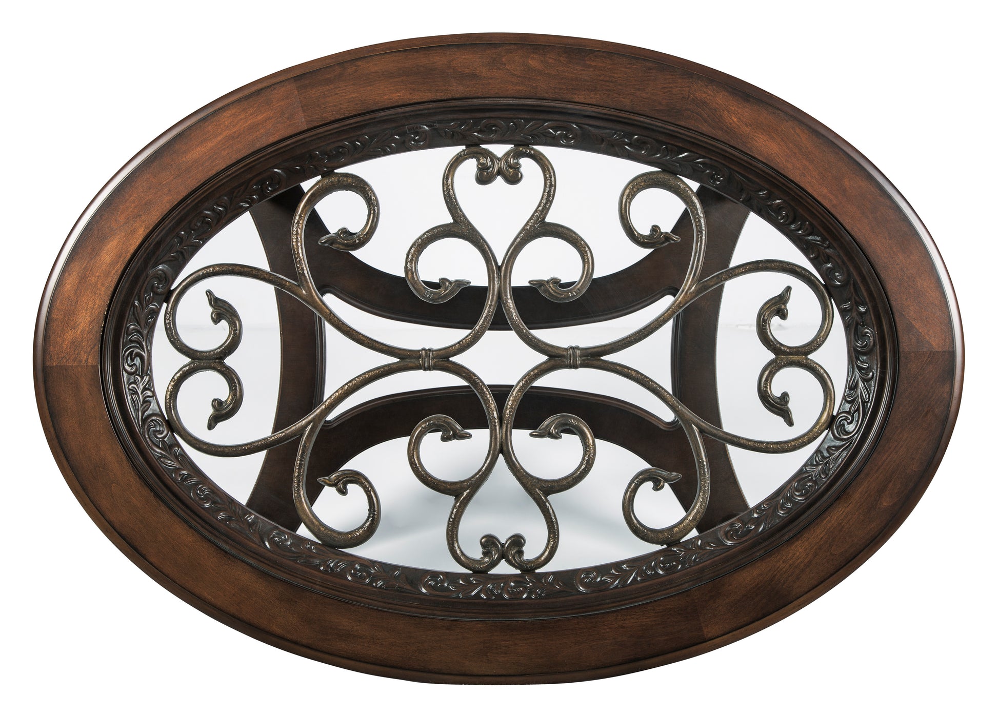 This oval coffee table deserves a toast for incorporating so many elements so seamlessly. Swirls of metal accents add a lovely dimension under a beveled glass inset tabletop. Their fanciful pattern is echoed in the carvings and curves of the richly stained legs and stretchers.